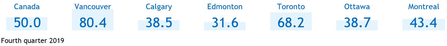 - Housing affordability will take a back seat: Though it’s still a big issue in Vancouver and Toronto, the pandemic and economic turmoil will draw more attention near term. RBC’s aggregate affordability measure for Canada was unchanged at 50.0% in the fourth quarter of 2019, after improving slightly in the three previous quarters.