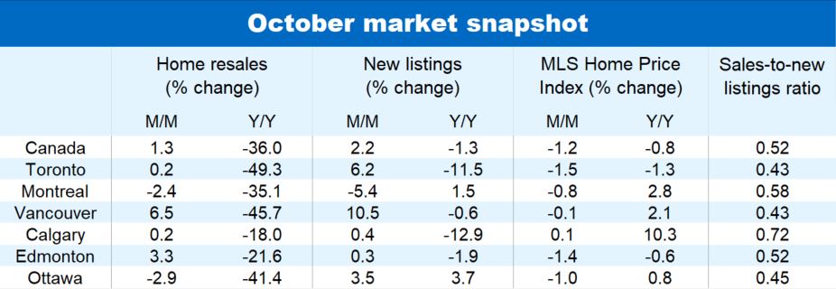 Home resales rose a slight 1.3% m/m in October across Canada to 424,600 units (seasonally adjusted and annualized). This potentially signals market activity is nearing a bottom after sliding 36% over the previous seven months. Among the small majority of local markets recording a monthly increase were Victoria (+19.7%), Vancouver (+6.5%), Edmonton (+3.3%), Saskatoon (+6.3%), Winnipeg (+2.2%), Hamilton (+1.7%), Saint John (+2.7%) and Halifax (+9.2%). Sales in Toronto and Calgary were essentially flat in the month (edging up just 0.2% in both cases), and fell further in Ottawa (-2.9%), Montreal (-2.4%) and Quebec City (-1.6%). The number of existing homes changing hands remained below—and often far below—year ago levels in virtually every market.