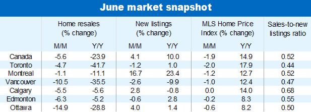 Earlier (super) tight demand-supply conditions are easing rapidly. Home resales in Canada are down 27% since February, including a 5.6% m/m drop in June. This occurred while the number of homes put up for sale increased slightly, giving buyers more options to pick from—and significantly reducing the degree of competition between them. Resale activity fell in the vast majority of markets between May and June with the few exceptions mainly found in Quebec and parts of Atlantic Canada. Declines were strongest in Ontario and British Columbia—as was the case in previous months—where buyers are most sensitive to the rise in interest rates.