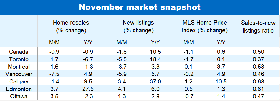 Though home resales (-0.9% m/m) were off just slightly from October in Canada, the lagged impact of market softening in prior months continued to weigh on home prices. The national MLS Home Price Index dropped for a third consecutive month (-1.1% m/m) in November, representing the largest month-over-month drop in nearly a year.
