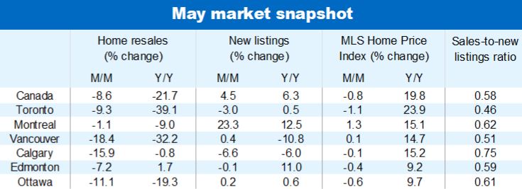 Home resales dropped to 512,000 units (seasonally adjusted and annualized) nationwide last month. This was the first time activity slipped below the 525,000 units recorded in February 2020 since the pandemic-era rally began in the summer of 2020. The situation varies vastly across the country though. Despite declining in May (and in several cases, April), activity remains strong—and well above pre-pandemic levels—in the Prairie and Atlantic Provinces. The Canada-wide softening entirely reflects trends in British Columbia, Ontario and Quebec where buyers are now clearly on the defensive.