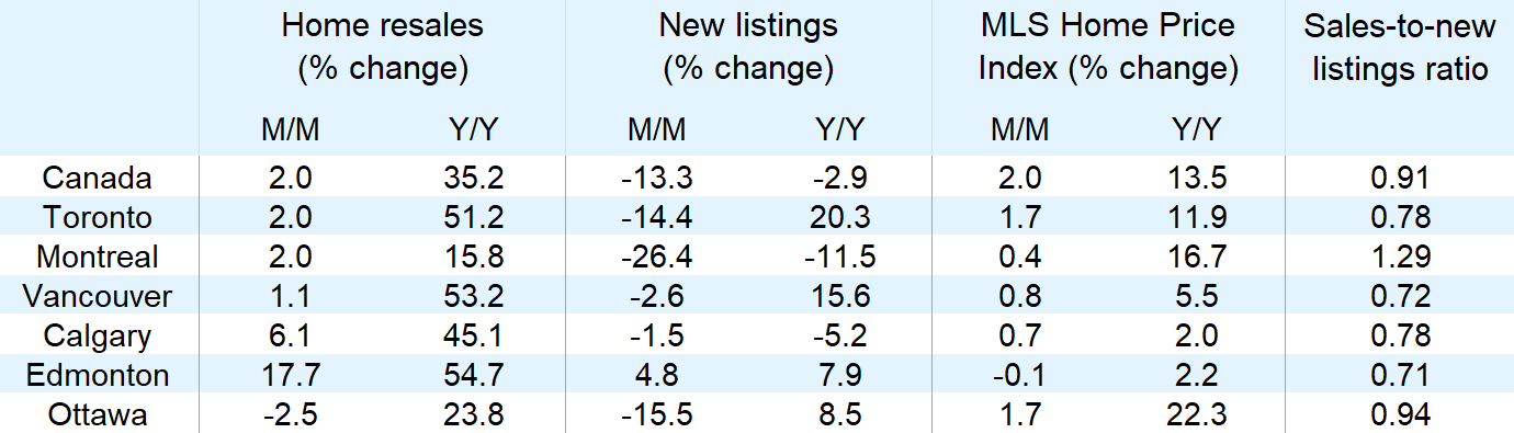 - Demand-supply conditions are the tightest they’ve ever been: At the current pace of sales, for-sale inventories in Canada would last just 1.9 months—the shortest period on record. The sales-to-new listings ratio surged further to 0.91—also a record. All but one major markets (Saskatoon) had a sales-to-new listings ratio well above 0.60 last month, indicating sellers had the upper hand in setting prices across virtually the entire country.