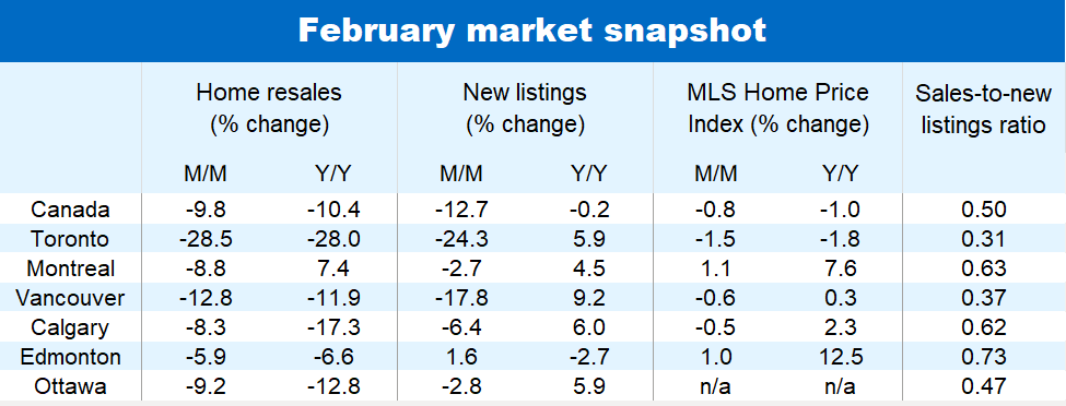 The pullback in demand last month was concentrated in Ontario and British Columbia, where affordability challenges are more acute. Home resales plummeted -29% from January in the Greater Toronto Area, -20% in Hamilton, -17% in the Niagara region and -15% in Kitchener-Waterloo. A series of severe snowstorms in southern Ontario also made house hunting more difficult.
