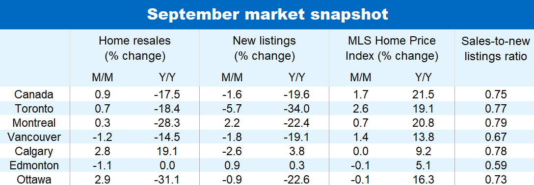 - Small decline in new listings: They fell 1.6% m/m —more than reversing the 0.8% increase recorded in August—and 19.6% from a year ago nationwide. Trends were similar in the vast majority of local markets. Windsor (up 7.9% m/m), Regina (up 1.4%) and Edmonton (up 0.9%) were among the few exceptions.