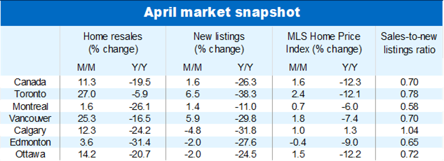 Earlier tentative signs of a turnaround in Toronto and Vancouver were confirmed in a big way in April. Home resales jumped 27% and 25% m/m, respectively, rolling back roughly one-quarter of the correction in one go. It appears buyers are quickly regaining confidence in both markets now that the Bank of Canada has paused its aggressive rate hike campaign.