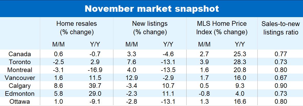 Low inventories and tight demand-supply conditions are endemic. The sales-to-new listings ratio—a usually reliable gauge of price pressure—remains tilted in favour of sellers (and often heavily so) in every market. Some easing in conditions took place in November with new listings rising in British Columbia (including Vancouver), Ontario (including Toronto), Quebec (including Montreal) and Nova Scotia (including Halifax). Yet this did little to rebalance markets in a meaningful way. Tight conditions are poised to keep driving prices higher in the near term.