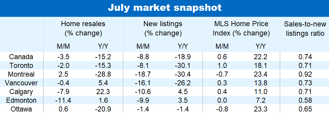 - Home resales eased for a fourth-straight month: They fell 3.5% from June in Canada to a still-strong 584,200 units (seasonally adjusted and annualized). A large majority of local markets recorded a decline, led by Saskatoon (-14.9% m/m), Quebec City (-13.9%) and Edmonton (-11.4%). Activity softened only modestly in Vancouver (-0.4%) and Toronto (-2.0%), and rose in Victoria (up 4.1%), Montreal (up 2.5%) and Ottawa (up 0.6%).