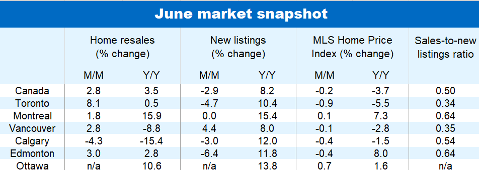 Canada’s housing market showed further signs of recovery in June with home resales picking up for a third straight month on a monthly basis. But, prices remained lower overall with nationwide declines largely driven by softening in Ontario and British Columbia.