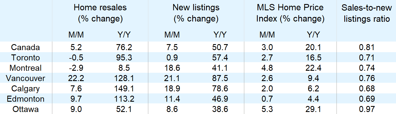 Sellers answered the call for more supply in March but, in the end, came well short of rebalancing Canada’s housing market. Buyers snapped up virtually all new listings, often following highly competitive bidding contests. This left the level of inventories at decades low, demand-supply conditions extremely tight and upward price pressure intense. Canada’s composite benchmark price (MLS Home Price Index) rose another $21,000 (3.1% m/m) last month, just shy of the $22,000 (3.3%) increase in February—the largest single-month rise ever recorded. Relative to a year ago, the benchmark price is up an astounding $120,000, or 20.1%.