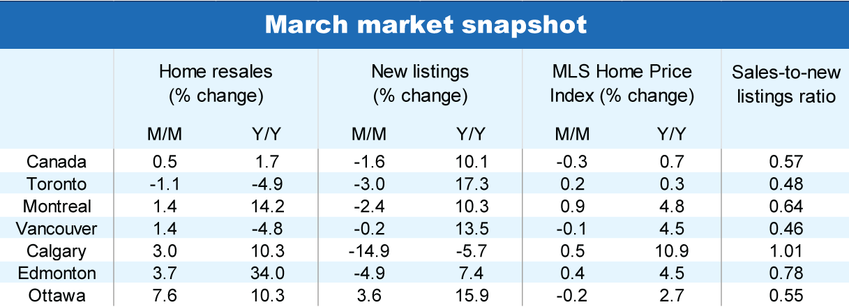 March brought a mixed bag of activity to Canada’s housing market. Resales continued to linger around February levels at the national level—still softer than activity that took place pre-pandemic.