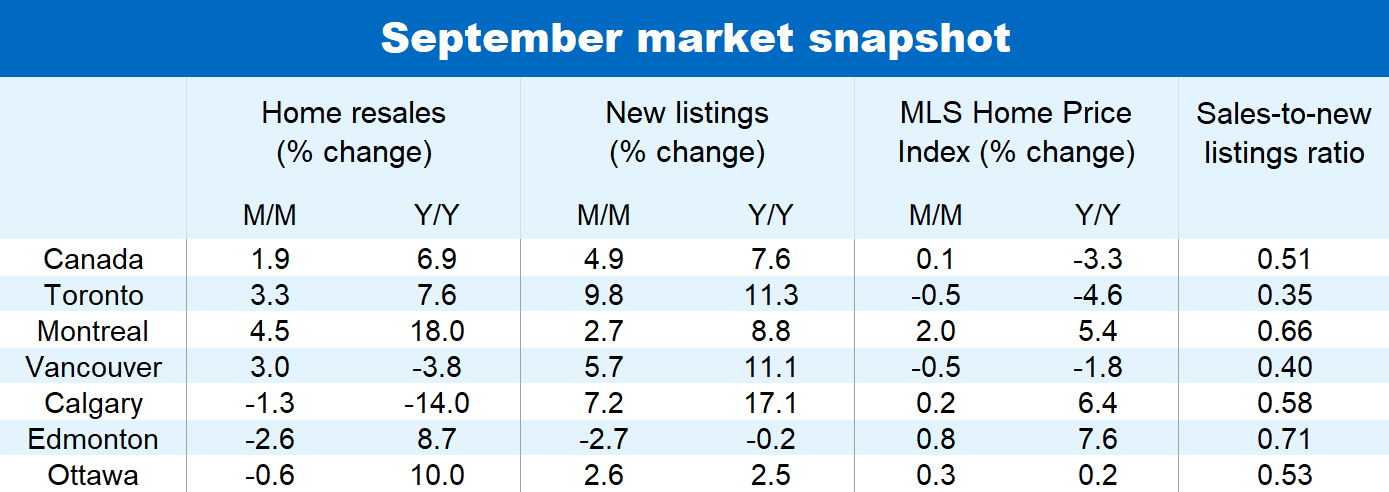 For the most part, the rise in supply is a welcome development. The dramatic drop in inventories during the pandemic made it significantly harder for buyers to find the right home, and it was a major factor contributing to soaring prices. The bargaining power of sellers and buyers has generally been rebalanced by now, which has stabilized property values. The national composite MLS Home Price Index benchmark (at $717,800 in September) has been essentially unchanged since spring. It rose just 0.1% from August and was down 3.3% from last year. It’s the biggest one-month drop since February 2023. The value of the benchmark single-detached home has fallen much less.