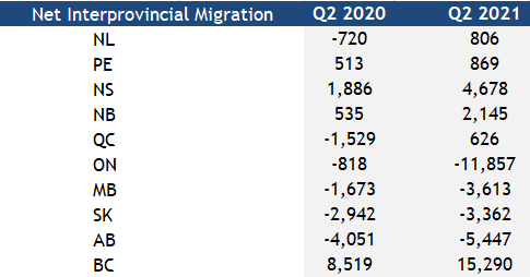 - Record numbers of Canadians moved to Atlantic Canada in Q2.