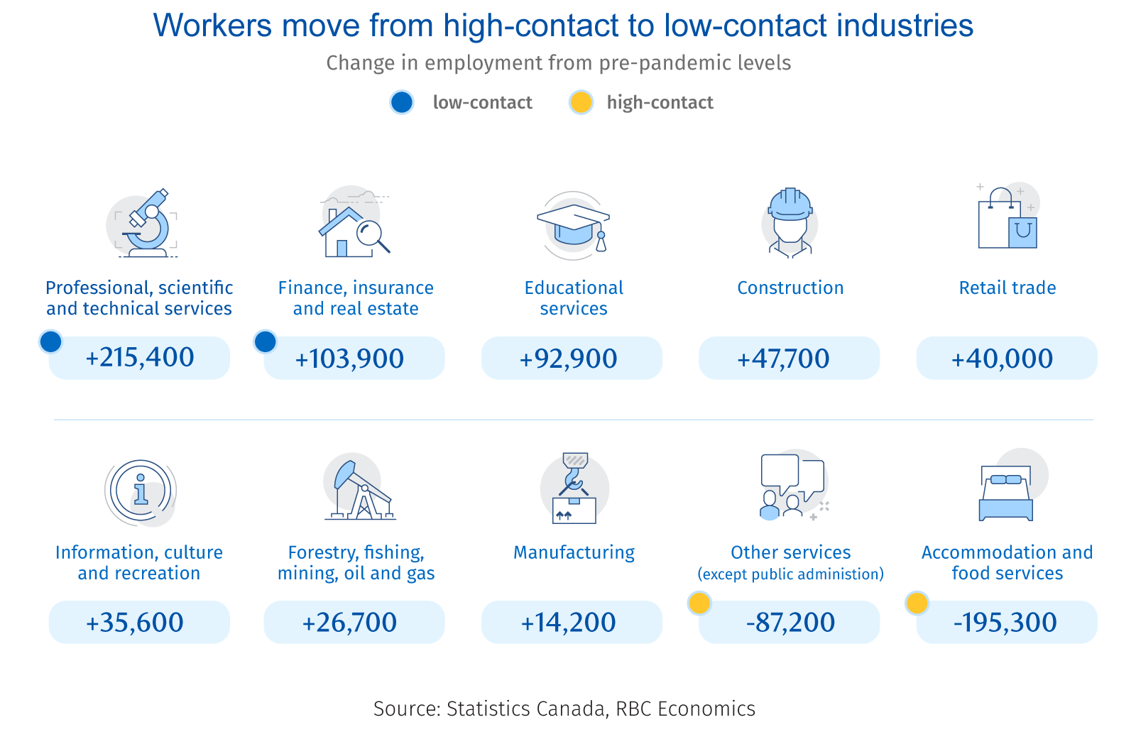 In the meantime, high-contact services will continue to struggle to find workers. But jobs within these sectors were already at higher risk of automation-related transformation to begin with, a StatCan report found. For these industries, the pandemic could act as an accelerator, pushing them to innovate by investing in automation.