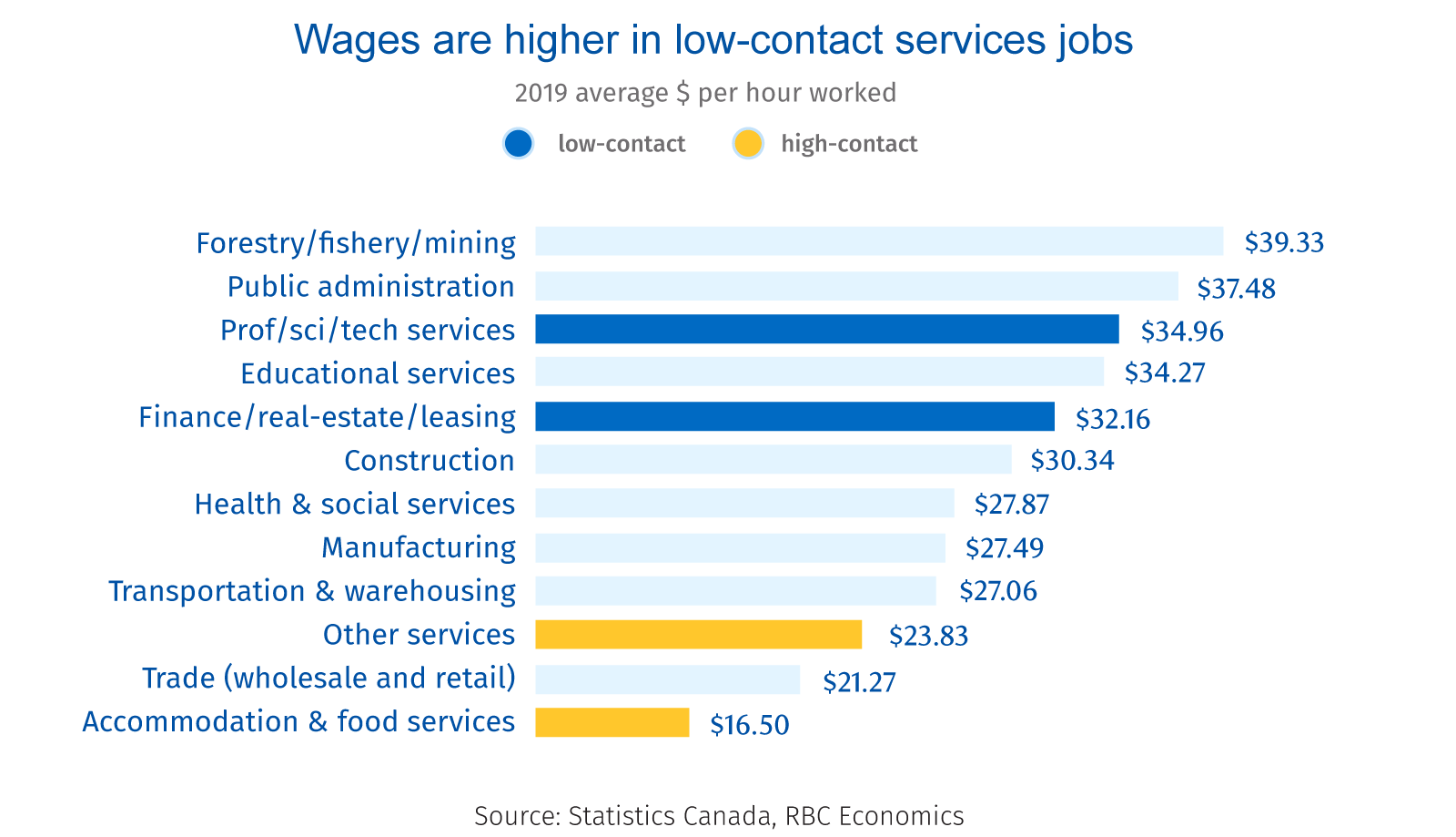 Education has been the key for workers seeking higher-paid positions. While the number of employees with post-secondary degrees or certificates has fallen sharply in high-contact services, it’s increased even more dramatically in low-contact industries. This includes professional and technical services as well as finance and insurance. Previously under-utilized, these workers’ post-secondary education is now being put to greater use—bettering overall productivity.