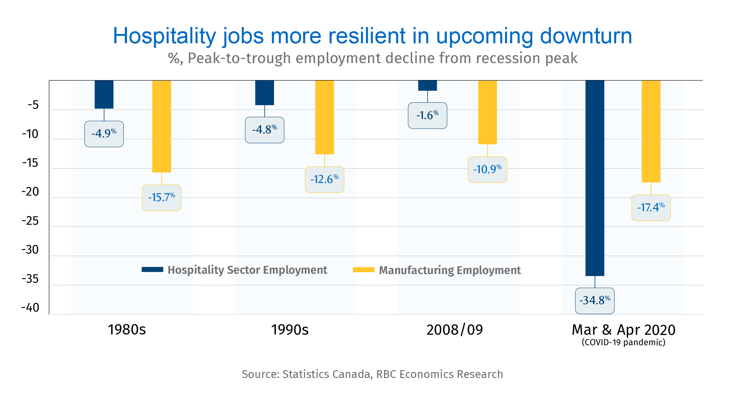 - The bottom line: The pain of the upcoming recession won’t be distributed equally among Canadian businesses and households. The manufacturing sector will likely be among the first to pull back while some high-contact service sectors like travel and hospitality could prove more resilient than in a ‘normal’ historical recession.