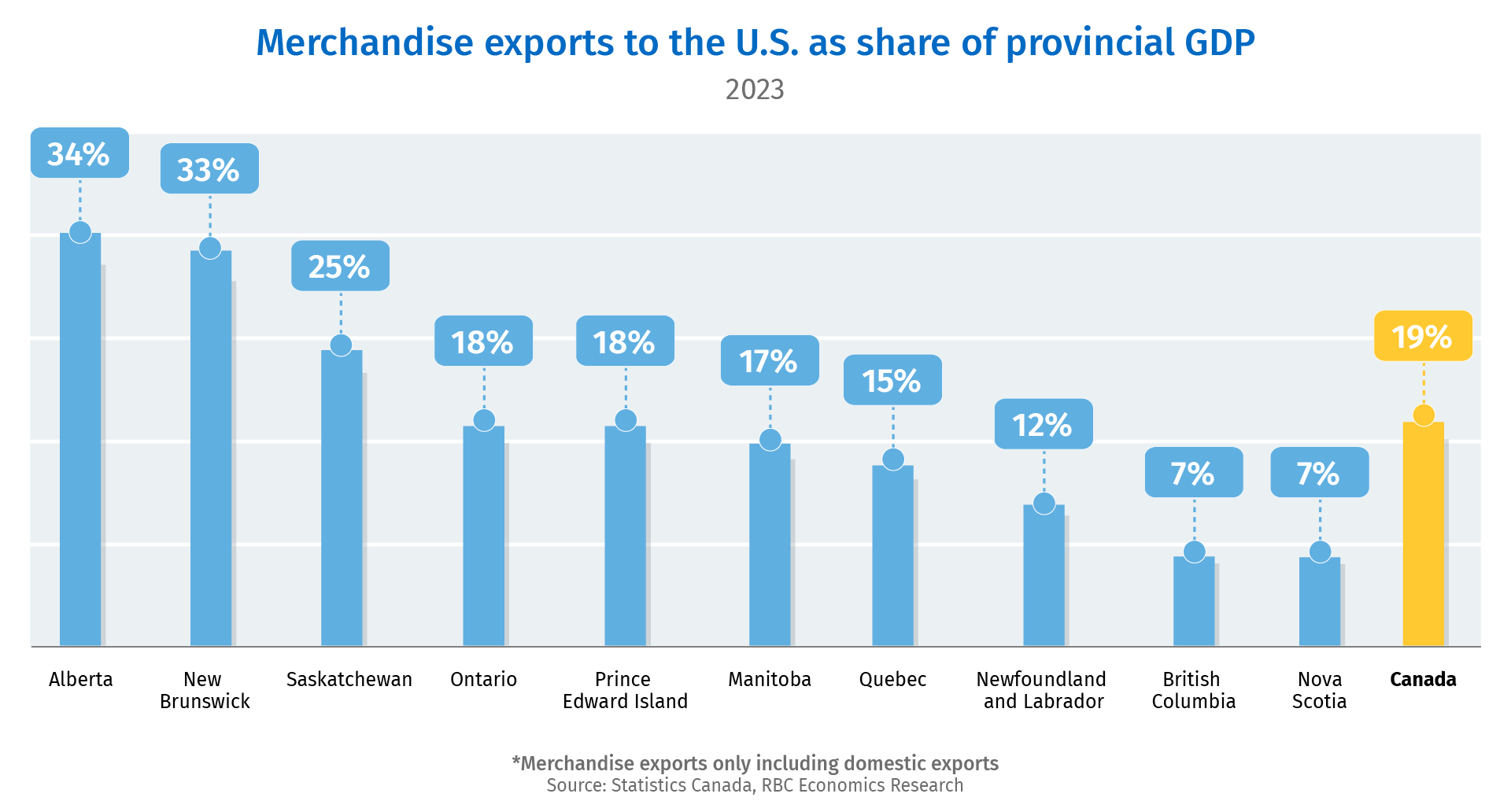 Energy exports from Saskatchewan and Newfoundland and Labrador, and British Columbia’s forestry sector would also see disruptions, but their overall exposure is somewhat mitigated by a smaller share of exports going to the U.S.