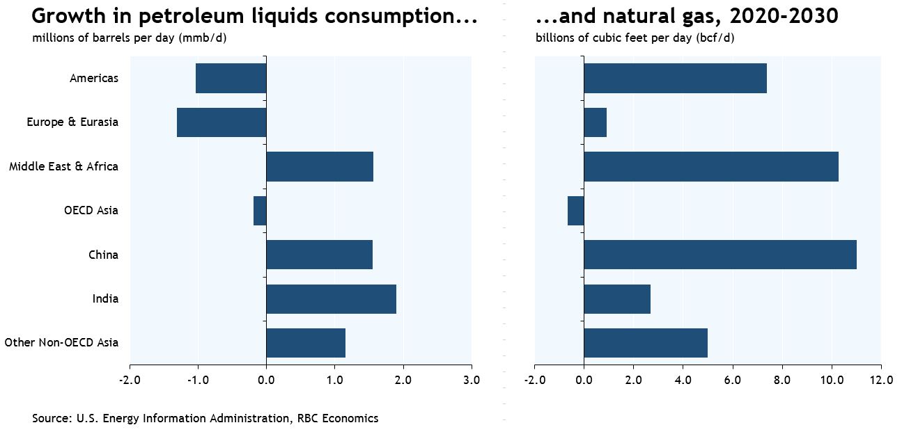 While clean energy is on the rise, demand for fossil fuels has not disappeared. Global petroleum demand is expected to rise by 3.6 mmb/d between 2020 and 2030. All of the demand growth will come from non-OECD countries—emerging Asian economies alone will need another 4.6 mmb/d of supply, equivalent to Canada’s entire production last year. Petroleum demand in the U.S., currently the destination for 96% of Canada’s oil exports, is expected to decline.