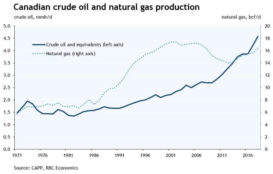 The real growth opportunities lie abroad. Canada has ambitions to export renewable energy technologies to other markets, aiding in the clean energy transition where demand growth is strongest. And there has been progress in that area—Canada exported more than $12 billion in environmental and clean tech products and services in 2017, a 50% increase from a decade earlier. [4] But the country can’t ignore its potential to export energy and not just energy technology. As we argued in Energy Matters, Canada can join global heavyweights in supplying more oil and gas to fast-growing markets. Canada is the world’s fourth largest producer of both crude oil and natural gas. Oil production grew by 9% in each of the last two years, hitting a record 4.6 mmb/d in 2018.[5] Meanwhile, natural gas production rose 5% last year, surpassing 16 bcf/d for the first time in a decade.