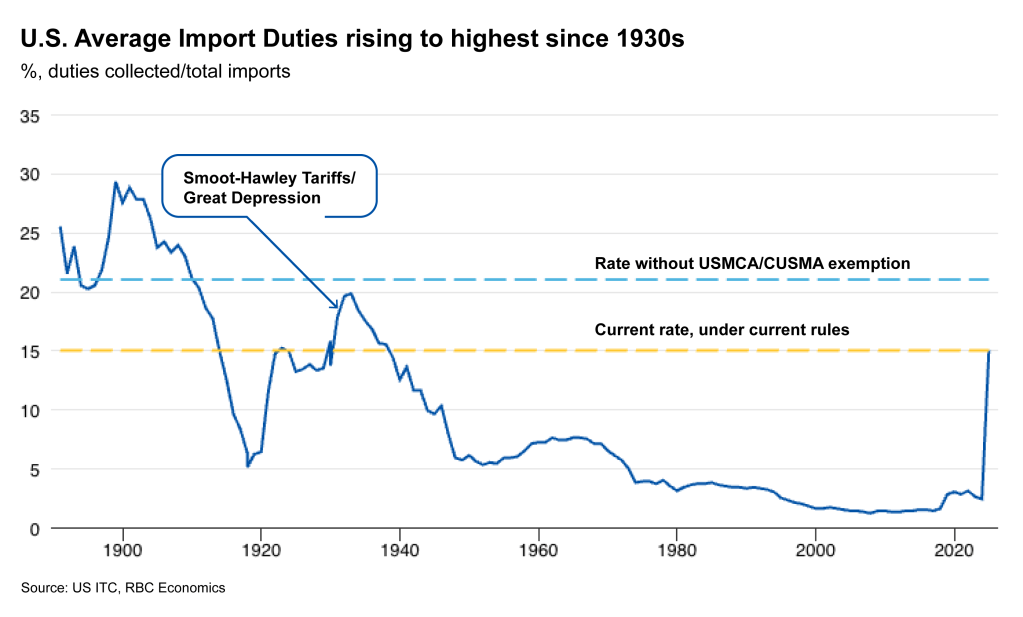 Our calculations suggest the average effective U.S. tariff rate that U.S. importers are facing is on pace to rise to 15% under current rules— a large increase from under 3% last year — but could further rise to above 20% if CUSMA exemptions are eliminated.