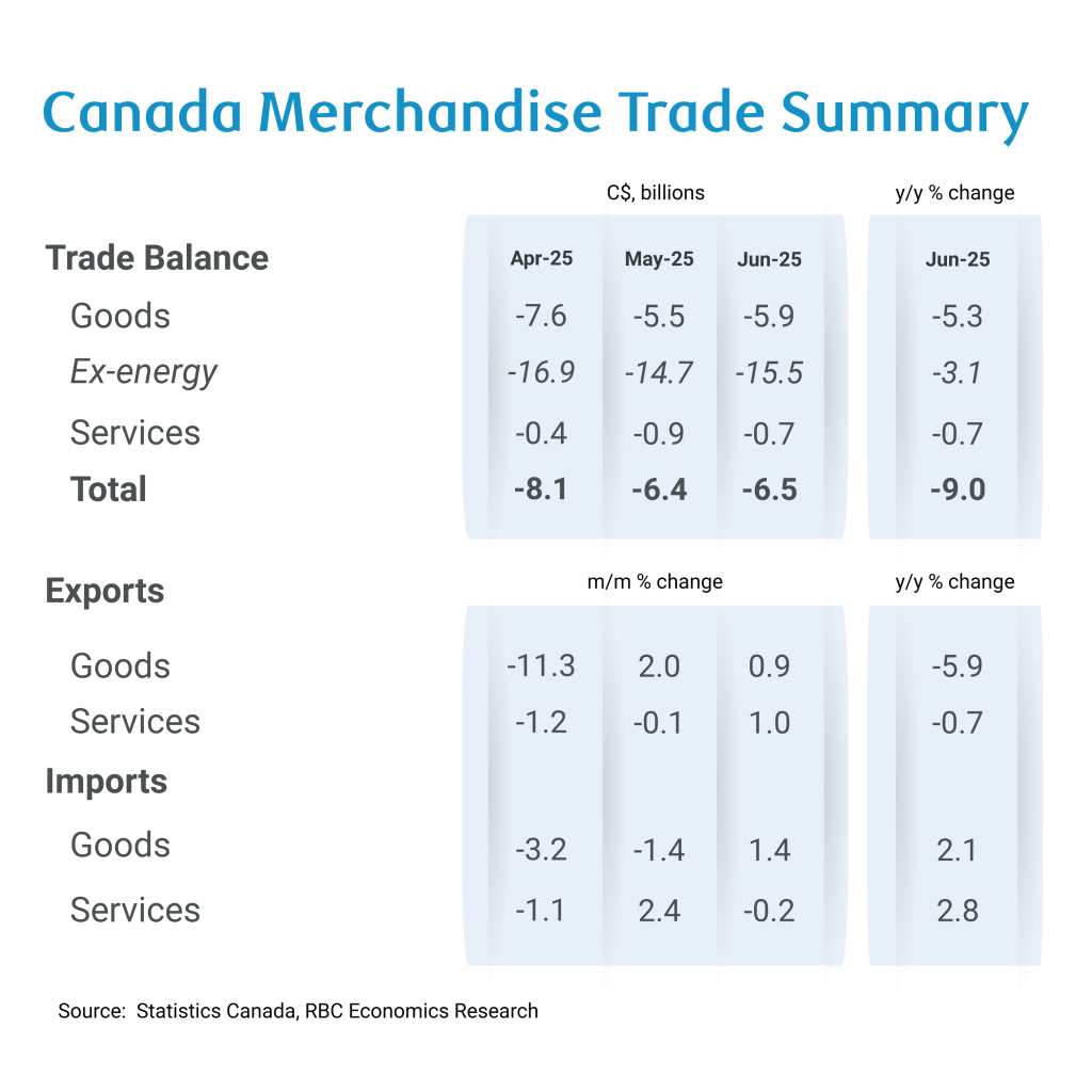 The average effective U.S. tariff rate on imports from Canada remained one of the lowest among U.S. trading partners at 2.4% — well-below the 8.9% average U.S. rate on all imports in June.  That effective tariff rate on imports from Canada will rise with an increase in the rate on products not compliant with the USMCA/CUSMA to 35% in August (from 25% in June) but that increase applies to a relatively small share (we estimate ~6%) of exports to the U.S. that are not USMCA compliant.