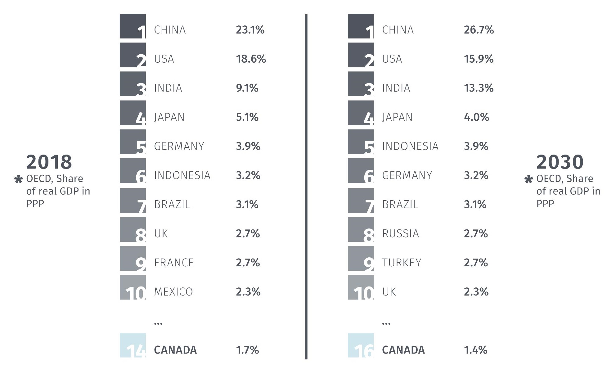 Canada’s share of real global GDP is set to fall to 1.4% in 2030 from 1.7% now, the OECD predicts. It will be imperative to look beyond Canada’s borders for growth opportunities. While the U.S. is set to remain our biggest export customer, it too will likely account for a smaller share of global output, with India and China continuing to capture greater shares. However, there are countries that will see even faster growth than China in the coming decade. Among them: Bangladesh, Vietnam and Kenya.