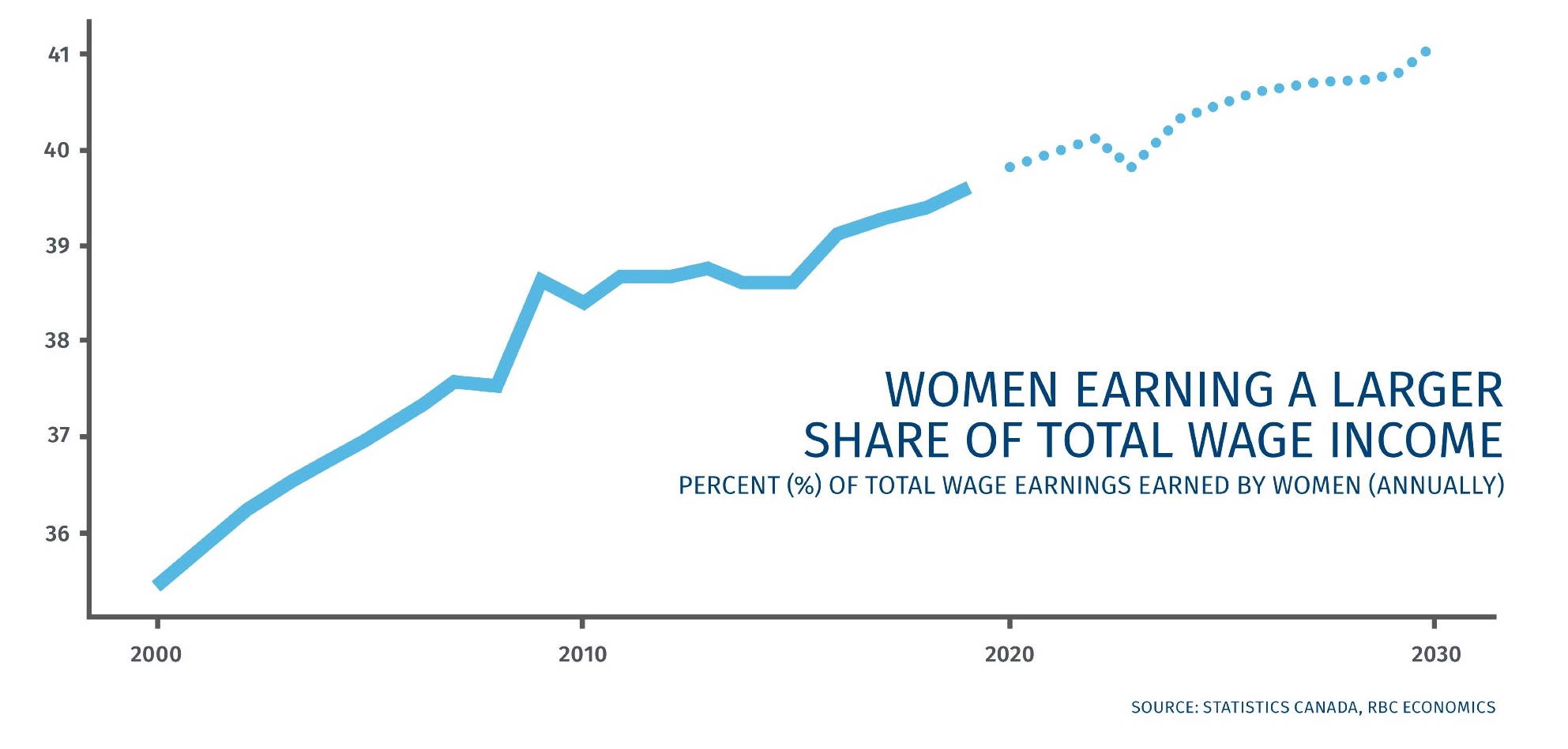 Canadian women have seen significant gains in the labour market over the past two decades, increasing their share of wage income from 35% to nearly 40%. Much of these gains came as younger cohorts, particularly millennial women, became more educated and attached to the labour force than their older counterparts. As older women continue to exit the labour force through retirement, and millennials enter their prime earning years, the share of earnings earned by women is expected to continue to increase.