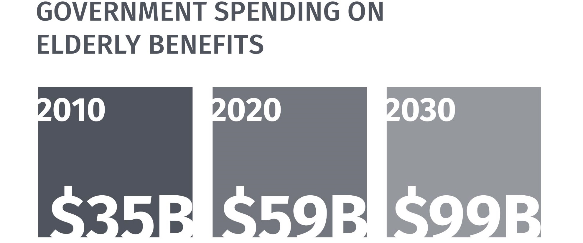 The financial demands of an older population will make it harder for governments to fund key growth priorities like education and skills development, let alone the vote-getting niche initiatives they often advance at election time. All levels of government will feel pressure from a shrinking tax base. Caring for seniors will consume 55% of provincial and territorial healthcare budgets in 2030 versus 45% now. Demand for long-term care beds alone could cost the provinces $50 billion in construction costs by 2035.