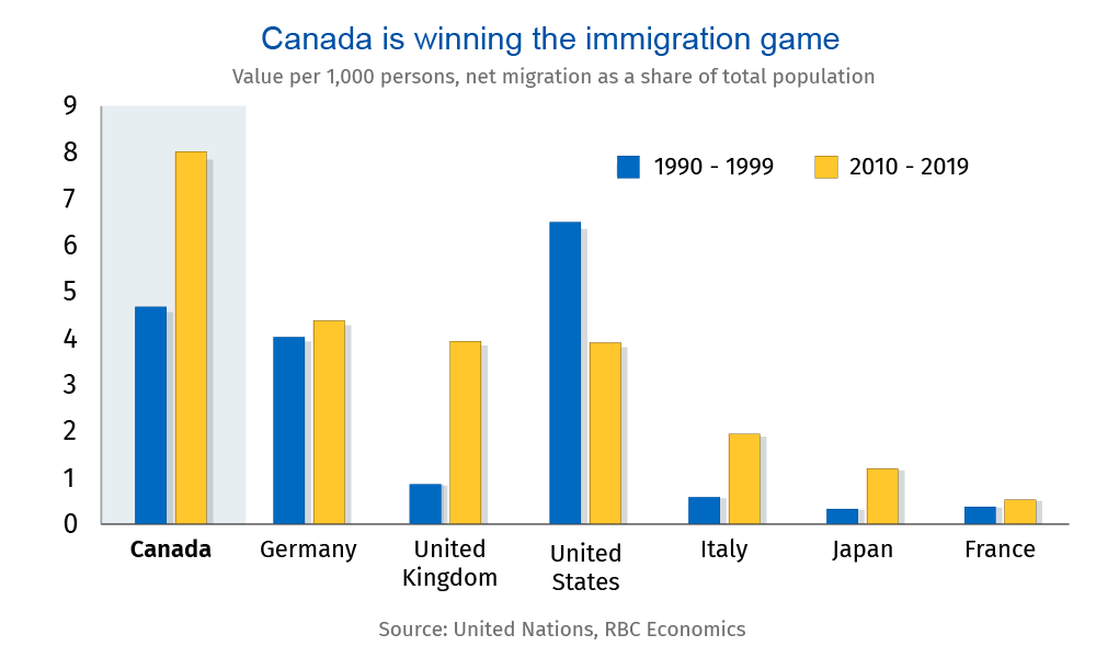 Few countries are doing a better job of attracting immigrants than Canada. On average, for every thousand people in Canada there were ~8 migrants (when emigration is accounted for) between 2010 and 2019. That’s the highest level among G7 countries—and considerably higher than the U.S., which held the top rate for net migration a couple of decades ago.