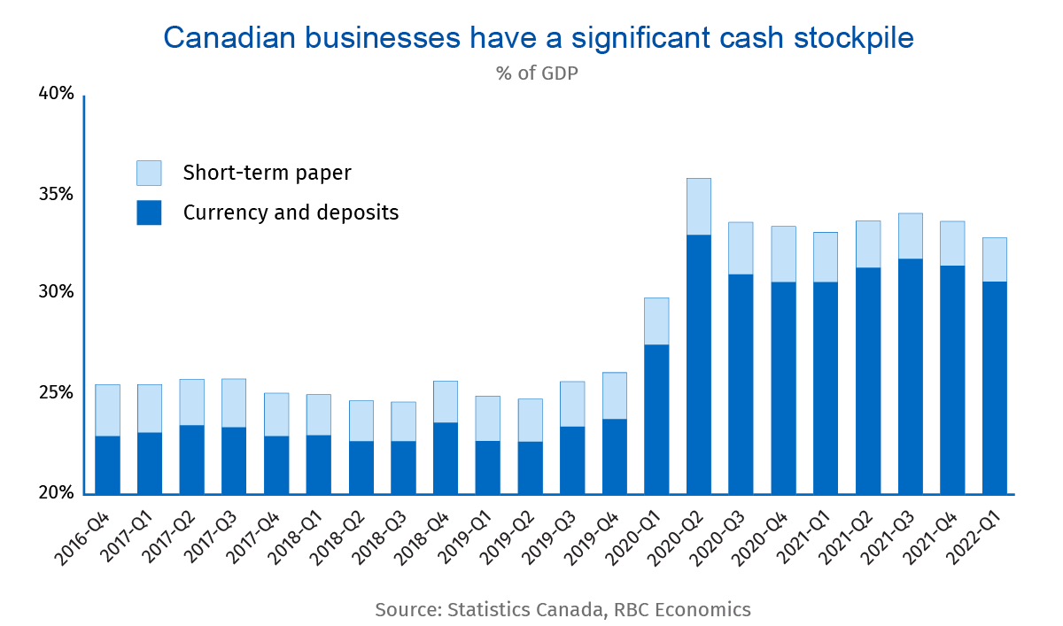 To ease the labour crunch, we’ll also need to better utilize and get more productivity out of the workforce we have. Improving childcare affordability for example, can help close the remaining labour force participation gap between men and women over the medium to long term. Canadian businesses are also responding to worker shortages by increasing capital spending. Imports of machinery and equipment, key indicators of capital investment, are 25% above pre-pandemic levels as of May. But businesses have the power to do more. Indeed, non-financial corporations have built a cash stockpile worth a third of annual Canadian GDP. More of that can be channeled to capital improvements.