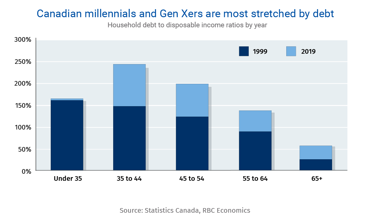 Canadians between the ages of 35 and 44 (who have debt) had a total debt-to-disposable income ratio of 250% in 2019. That’s far heavier than the debt load that was carried by Canadians of the same age in 1999 (~150%). Younger indebted millennials (under age 35) aren’t faring much better, with debt loads worth 165% of their disposable income. Surprisingly, this youngest cohort hasn’t seen its debt-to-income ratio rise materially since 1999, though its home ownership rate is much lower (only one-third have a mortgage).