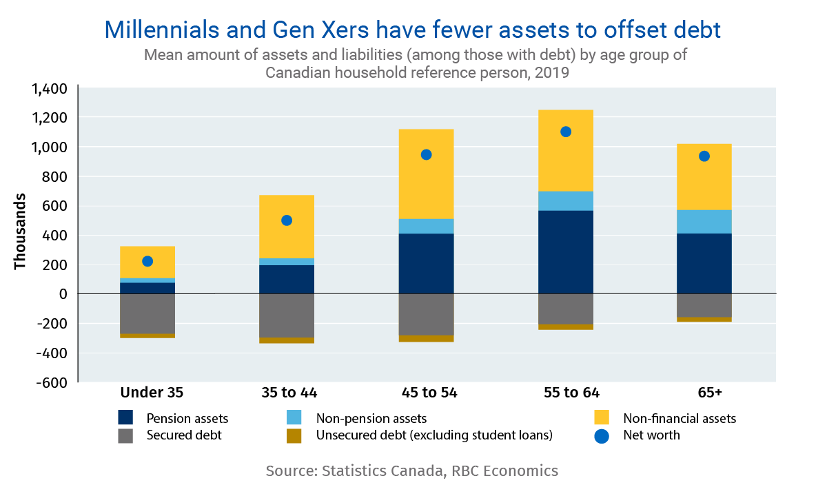Boomers—Canada’s largest cohort—are faring better. Those aged 65 and older account for nearly a quarter of tax filers and 20% of total household income. And as a general rule, this group is far less sensitive to interest rate hikes. That’s because only 14% of boomer households still have mortgage debt and for those that do, the average balance is half the size of a millennial mortgage. Boomers and older Generation Xs (aged 55 and up) have also amassed a bigger basket of interest-earning assets—which stand to benefit from a higher interest rate environment. Canadians’ personal term deposits in chartered banks have risen $200 billion above pre-pandemic levels, largely due to the lure of higher interest rates.