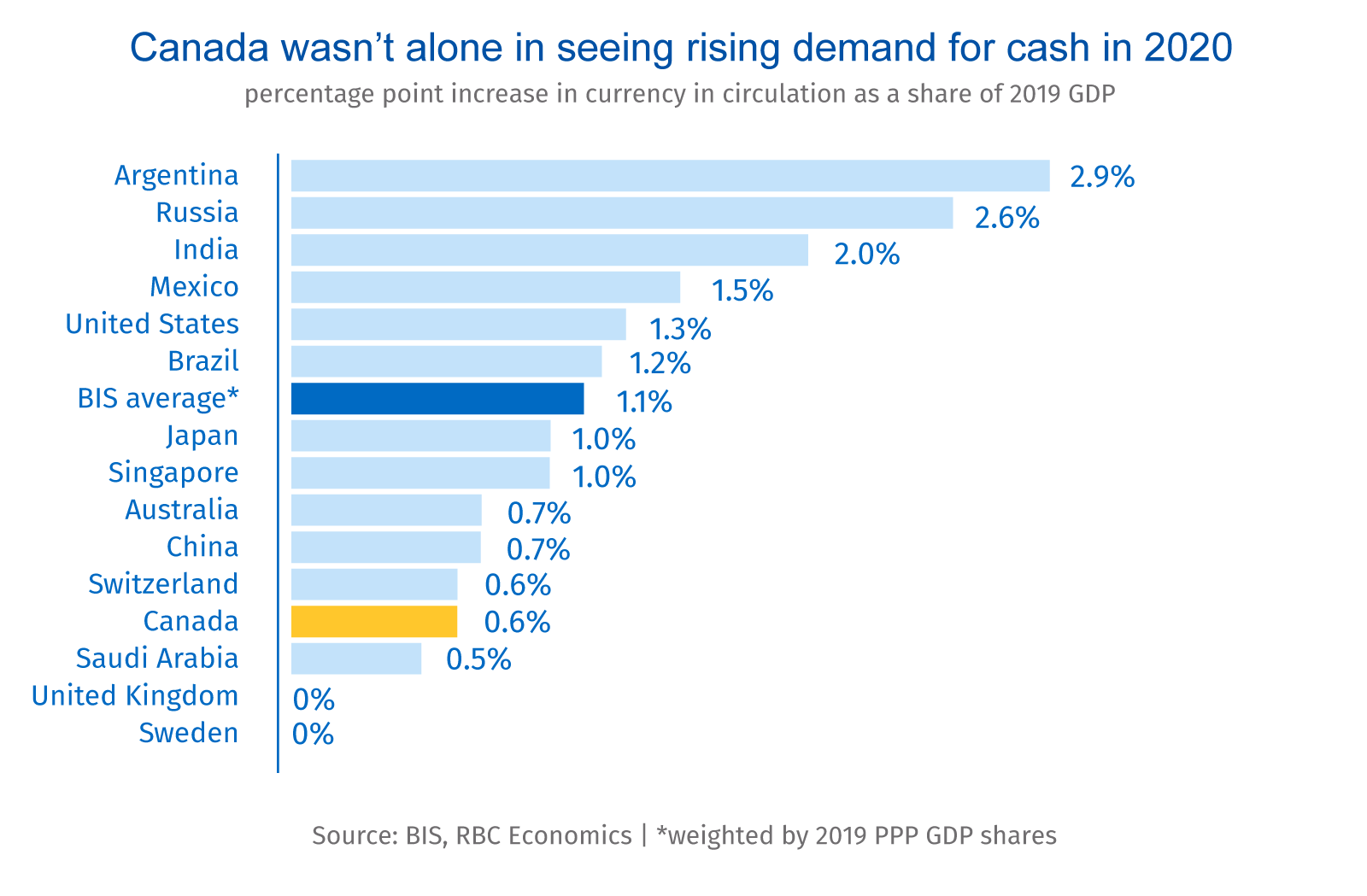 This trend isn’t unique to Canada. The U.S. and euro area saw an even greater increase in cash as a share of pre-pandemic GDP. Only more cashless societies like the U.K. and Sweden failed to see a pandemic cash bump.