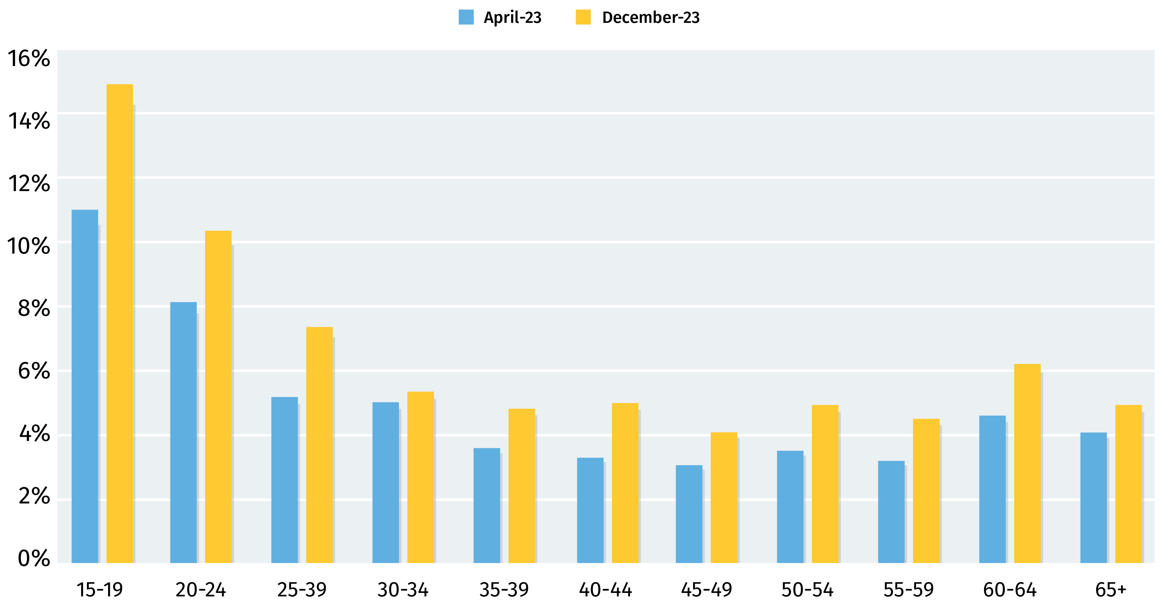 aged 15+ between April and December 2023 (seasonally adjusted)
