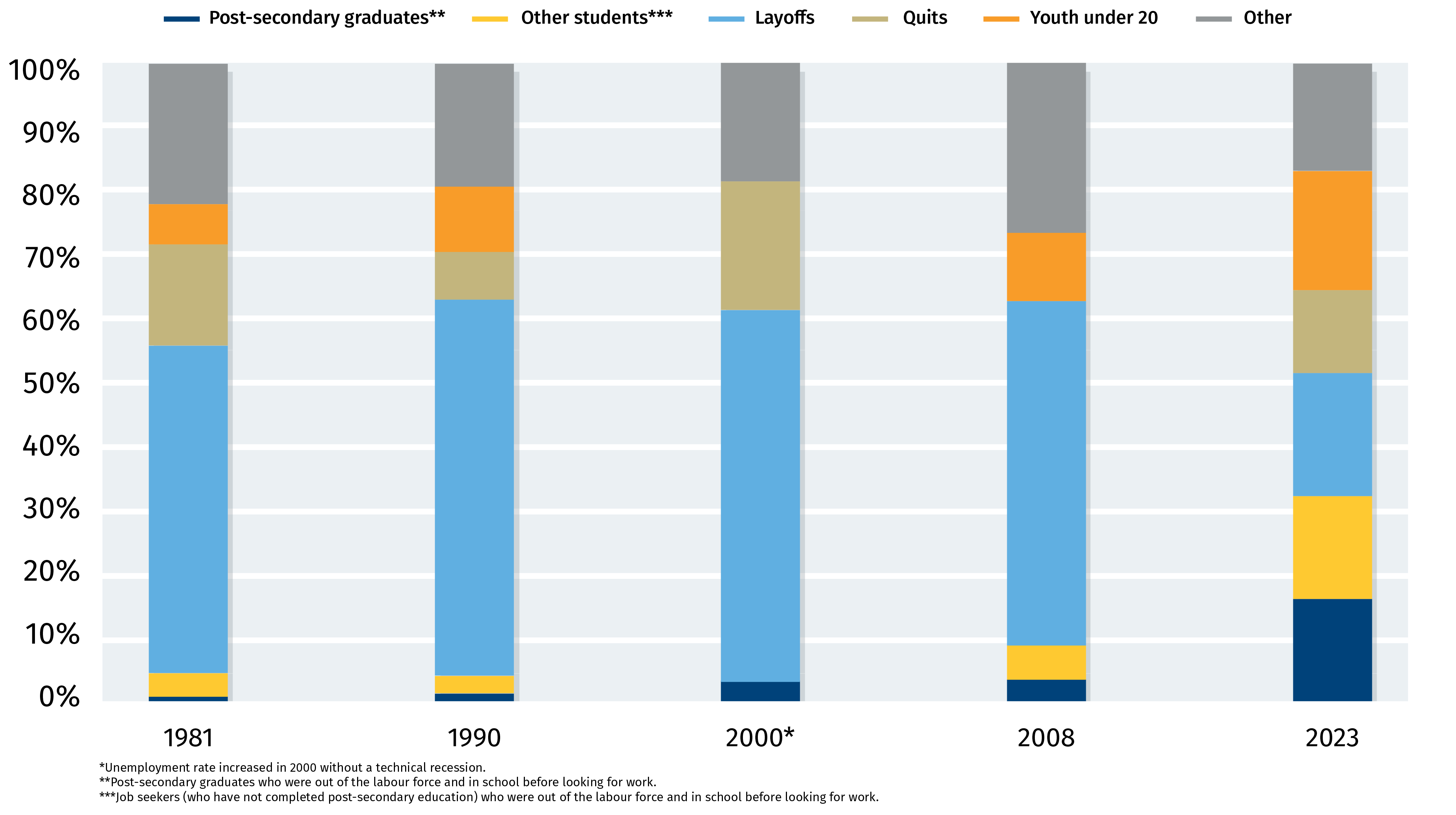 - The magnitude and pace of Canada’s rising unemployment rate are consistent with trends observed during past recessions.