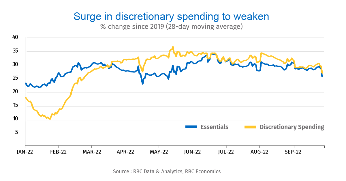 Spending on travel and leisure services will likely continue in the near-term (though at lower levels) as pent-up demand is released, particularly by higher income households. But our own RBC Cardholder data shows Canadian spending plateaued in the summer months after taking off in the spring following the Omicron-induced lockdowns.