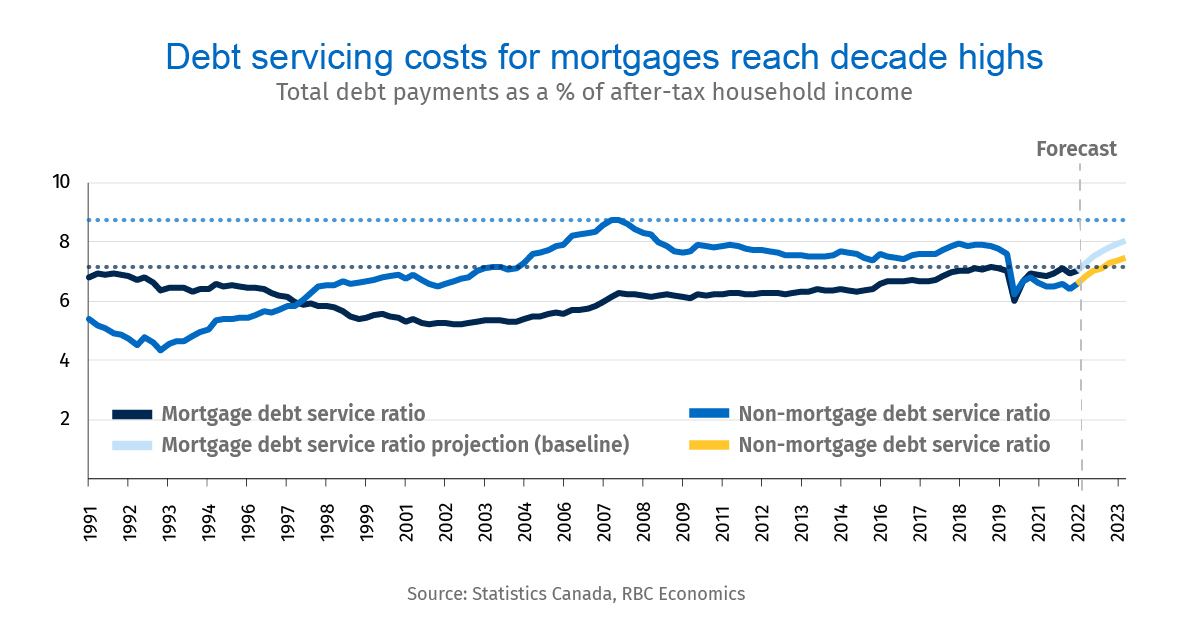 Discretionary or non-essential spending on things like home furnishings and renovations drove the pandemic spending surge. But as interest rates rise and price pressures persist, Canadians will increasingly prioritize necessities like groceries and gas—and debt. We estimate households will soon have to allocate 15% of their take-home pay just to debt servicing, with half of this attributed to mortgage costs.