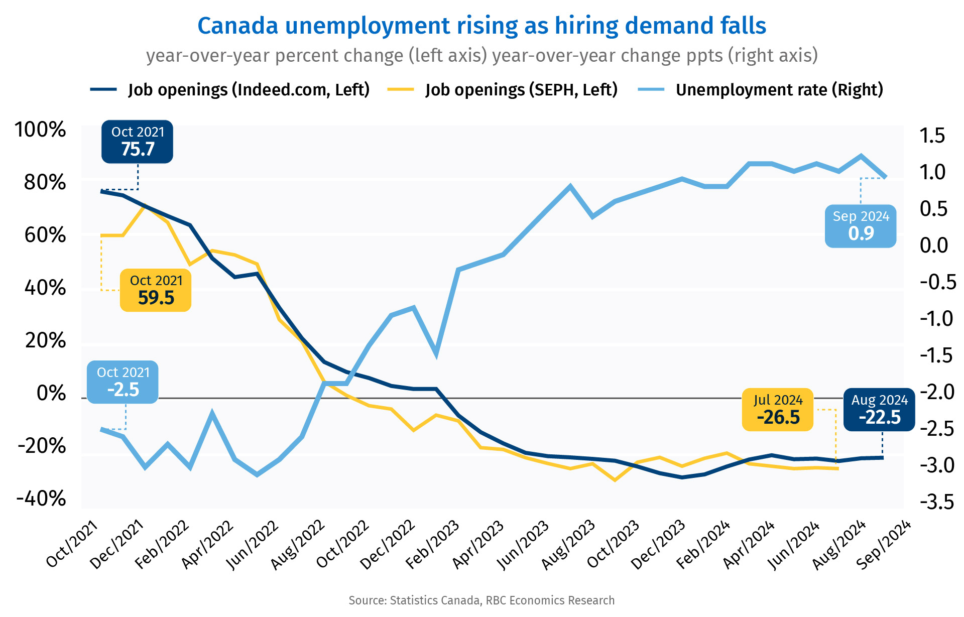 Higher mortgage payments certainly hurt the total amount of income available in the economy to spend, but higher unemployment does as well. We anticipate a 1 percentage point rise in the unemployment rate typically lowers household disposable income in the economy by 0.5%. Our forecast calls for continued modest rises in Canada’s unemployment rate from its low of 5% in mid-2022 to 7% by early 2025. That’s a significant increase and more than a percentage point above pre-pandemic levels. But, we’re watching for deterioration that might extend beyond that.
