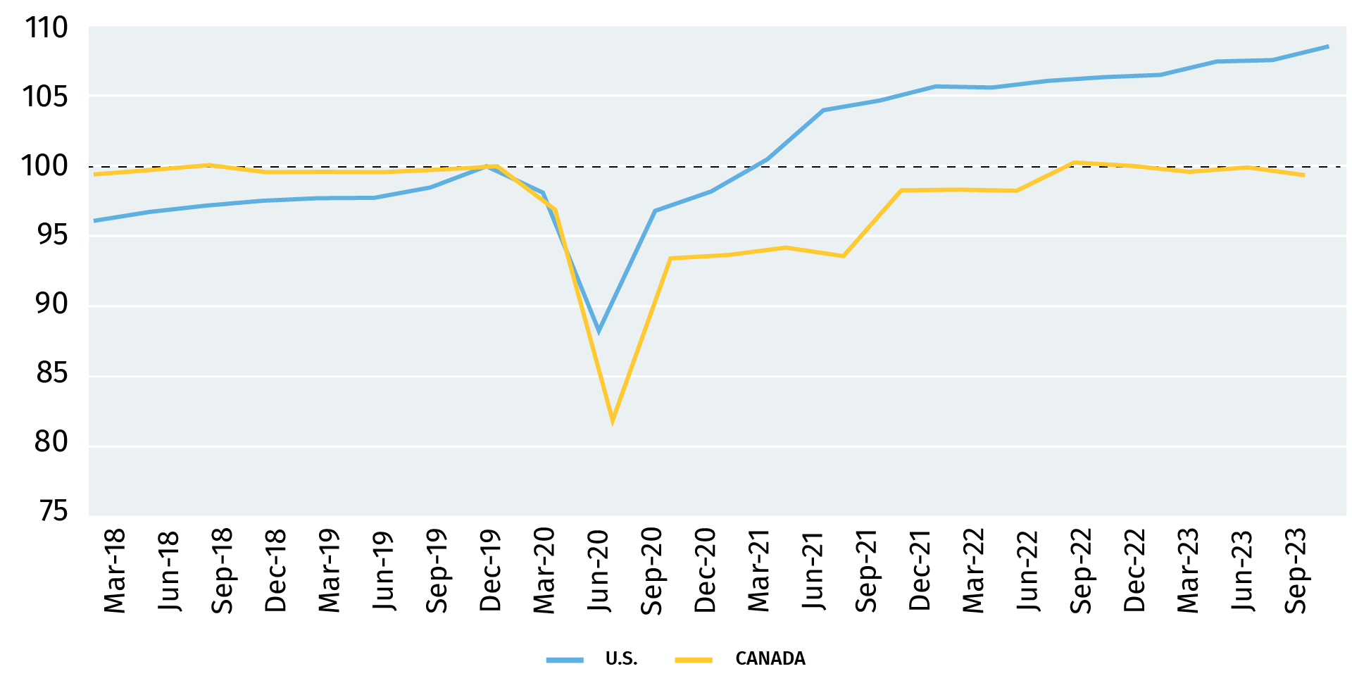 But south of the border, consumer spending has yet to soften. The U.S. has significantly outperformed Canada this year, with per capita consumer spending continuing to soar well-above pre-pandemic levels. Per-person U.S. spending was running almost 2% above year-ago levels as of Q3.