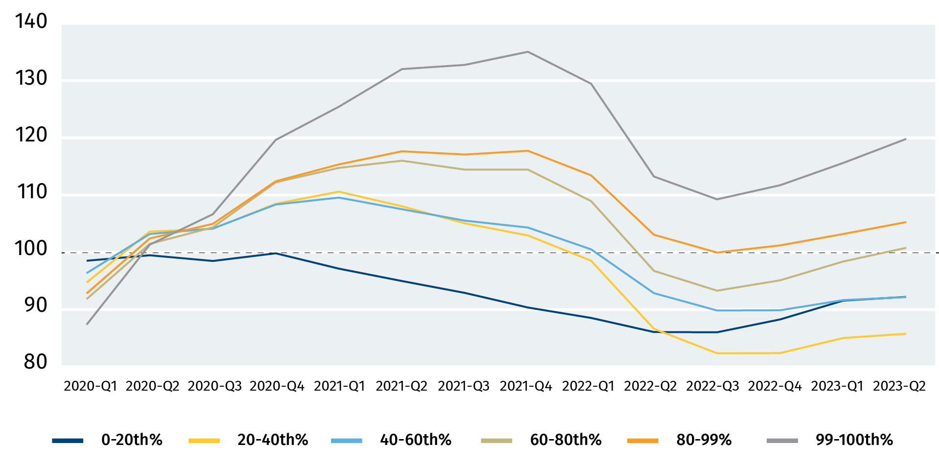 But households in the U.S. have been more willing to spend out of ‘excess’ pandemic savings. Households in both the U.S. and Canada built up large amounts of savings during the pandemic thanks to government transfers that propped up incomes at a time when there were fewer spending opportunities due to lockdowns. In the U.S., cumulative “excess” savings peaked at over 9% of GDP two years ago and have shrunk to ~3.5% of GDP currently. And most American households are now worse off than they were before the pandemic from a savings perspective. After adjusting for higher prices, the bottom 80% of income earners have less net financial assets than they did before the pandemic with only the top 20% of income earners having retained some savings.