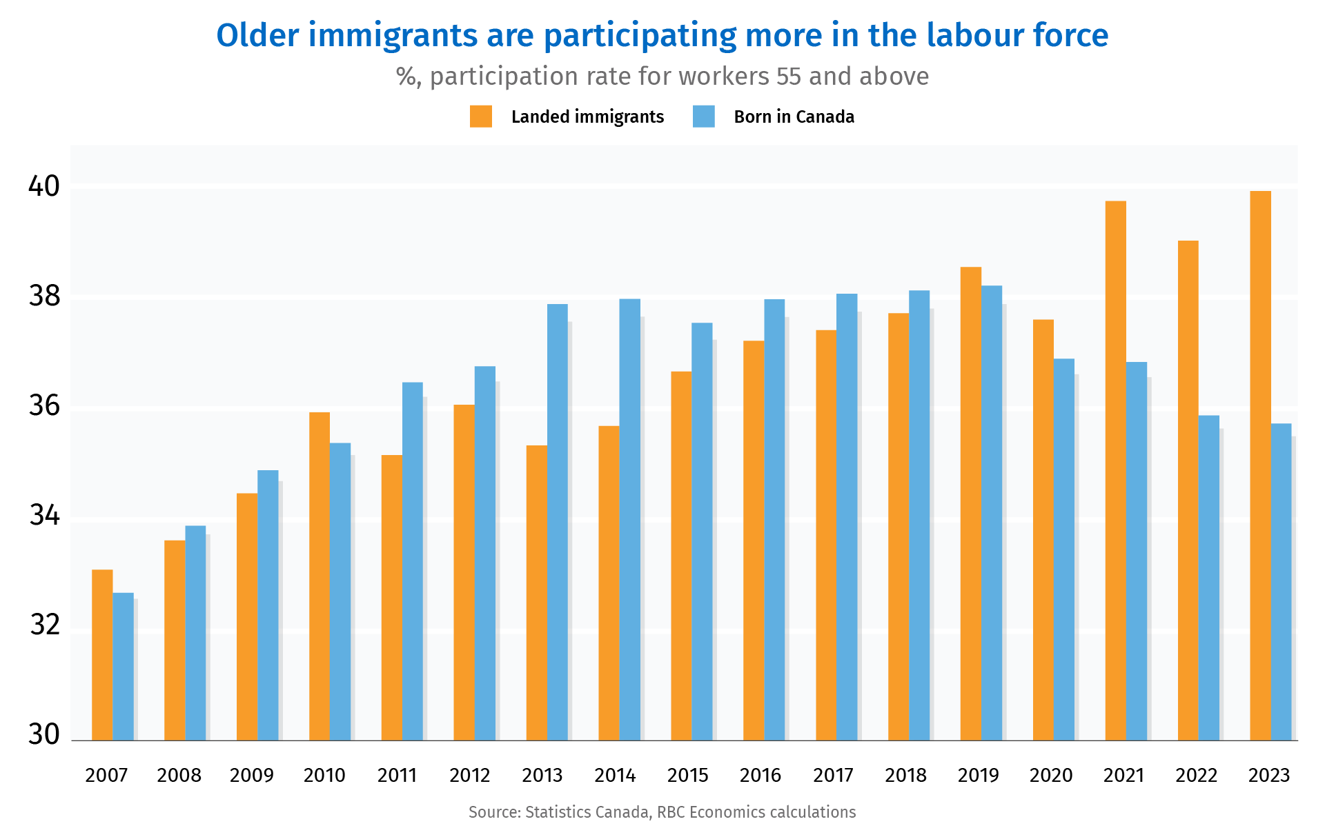 Immigrants are outperforming their Canadian-born peers when it comes to labour force participation. That’s especially true for immigrant workers aged 55 and above, who have increasingly chosen to keep working and retire later. Economist Claire Fan examined how immigrants’ participation in the labour force surpasses those born in Canada and whether it’s helping mitigate demographic pressures.