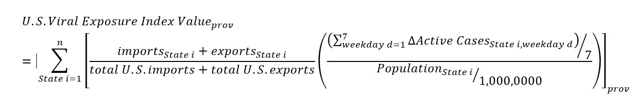 RBC’s trade exposure index utilizes daily U.S. novel coronavirus (COVID-19) data from Johns Hopkins University. We constructed the index with the goal of ranking each province’s relative trade exposure to U.S. COVID-19 “hotspots.” To calculate viral risk for each state, we determine each state’s active caseload per population of 1,000,000 (population by state is based on 2019 U.S. Census data). Next, we measure provincial trade exposure for each province to a given state by calculating the province’s imports and exports to that state as a share of the province’s total imports and exports to the U.S. We consider each state in the continental U.S. and Hawaii, excluding unspecified states and overseas U.S. territories. Viral exposure by state is calculated by multiplying viral risk for a given state by provincial trade exposure to that state. To derive the index value for each province, we sum viral exposure to all continental U.S. states and Hawaii for that province. The following expression is a representation of our calculation for each province, for a given state i for a province that trades with n total U.S. states.
