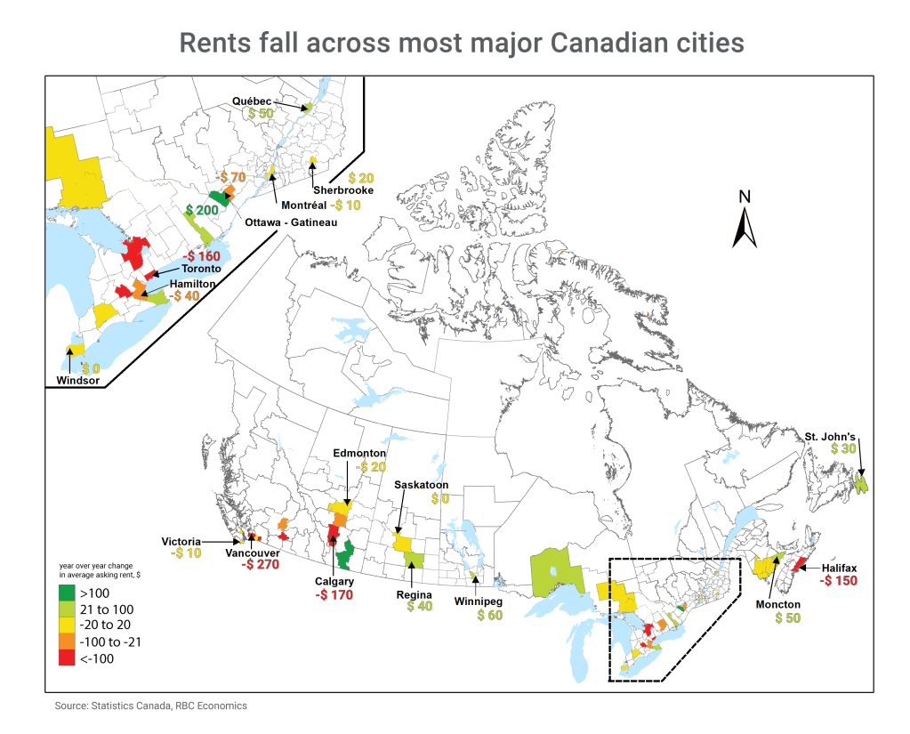 Rents are now declining in more than half of Canada’s 40 Census Metropolitan Areas (CMAs) from a year ago.
