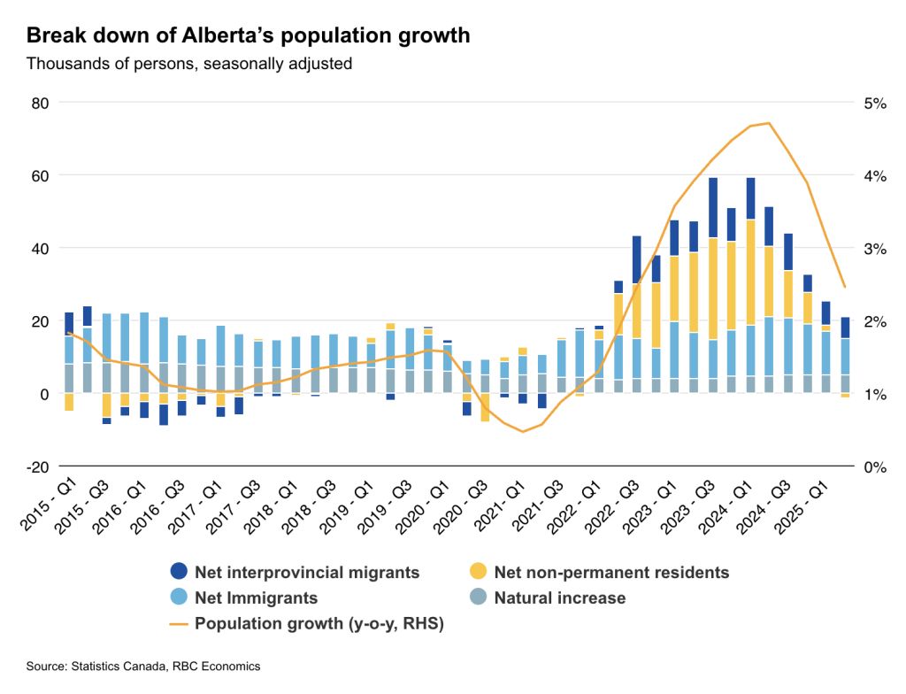 Interprovincial migration has also played a key role. Alberta’s relative affordability advantage continues to attract residents from higher-cost provinces like Ontario and British Columbia. Over the past year, about 28,000 net interprovincial migrants settled in Alberta, building on roughly 88,000 in the preceding two years. Q2 2025 marked Alberta’s 12th consecutive quarter leading the country in interprovincial migration.