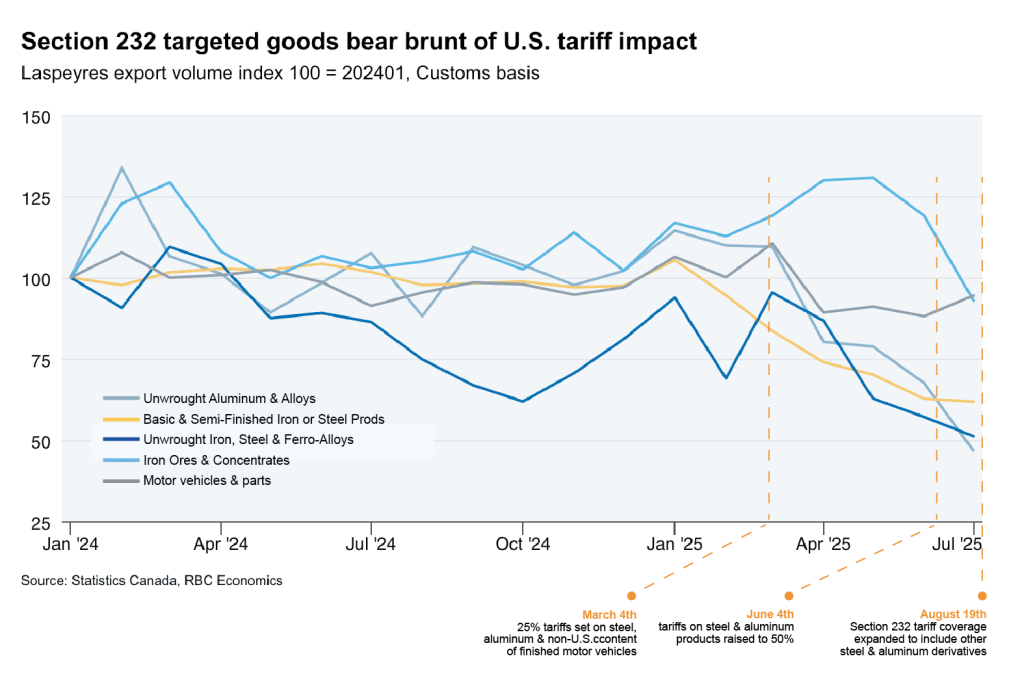 Among Canadian exports, products subject to Section 232 tariffs—largely excluded from CUSMA exemptions—have borne the brunt of the impact.