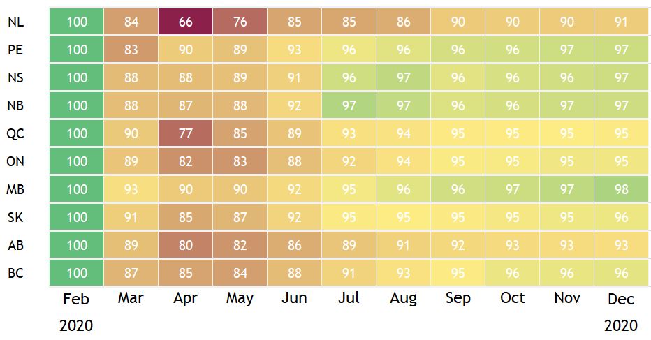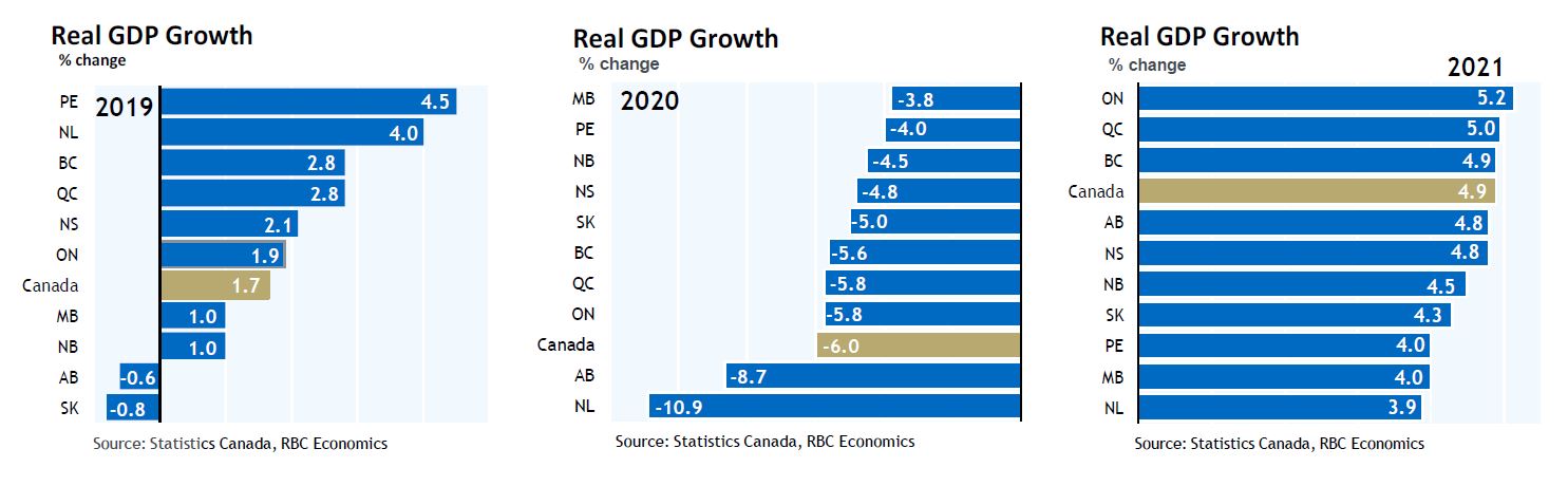 No economy in the world is emerging unscathed from the coronavirus. Neither is any Canadian province. Each is facing an unprecedented (or close to unprecedented) decline in activity this year. Viral transmission rates have varied from coast to coast and so have the stringency of containment measures and reopening timelines. These differences dictate the severity of the economic shock across the country. Relatively better health outcomes and faster easing of restrictions limited economic damage in Manitoba, Saskatchewan and most of the Atlantic Provinces. Alberta and Newfoundland and Labrador, on the other hand, have been further challenged by plunging oil prices, sapping a major source of revenue. British Columbia, Ontario and Quebec are experiencing a downturn of roughly similar magnitude as the 6.0% contraction we project for the national economy.