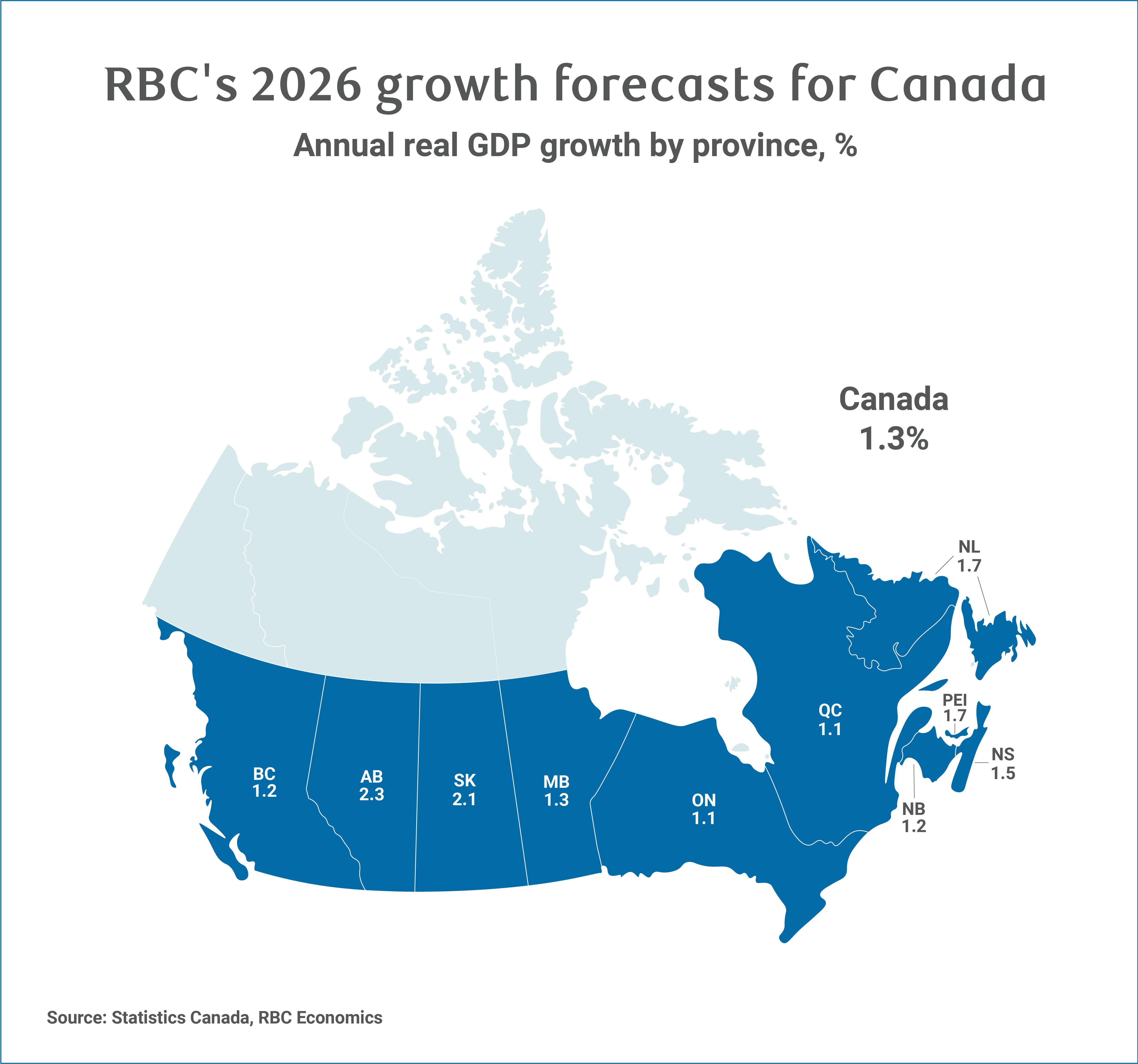 Trade-exposed provinces in central Canada face mounting pressures. Ontario and Quebec are both projected to grow 1.1% in 2026 as U.S. tariffs on steel, aluminum, and lumber weigh on manufacturing exports.