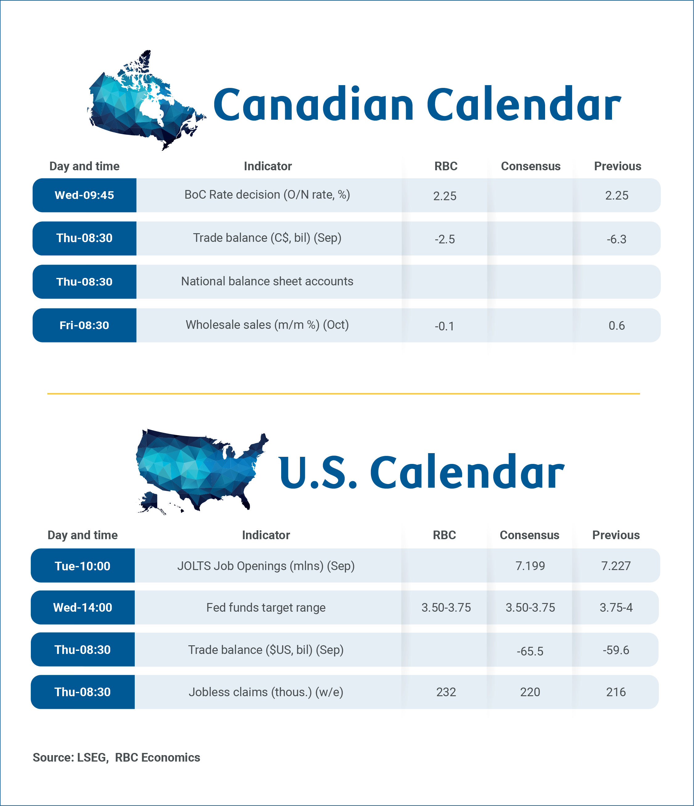 Dual central bank interest rate decisions from the U.S. Federal Reserve and the Bank of Canada on Wednesday top the week’s calendar, with the BoC expected to hold rates, while a third consecutive 25 basis point cut from the Fed looks highly likely.