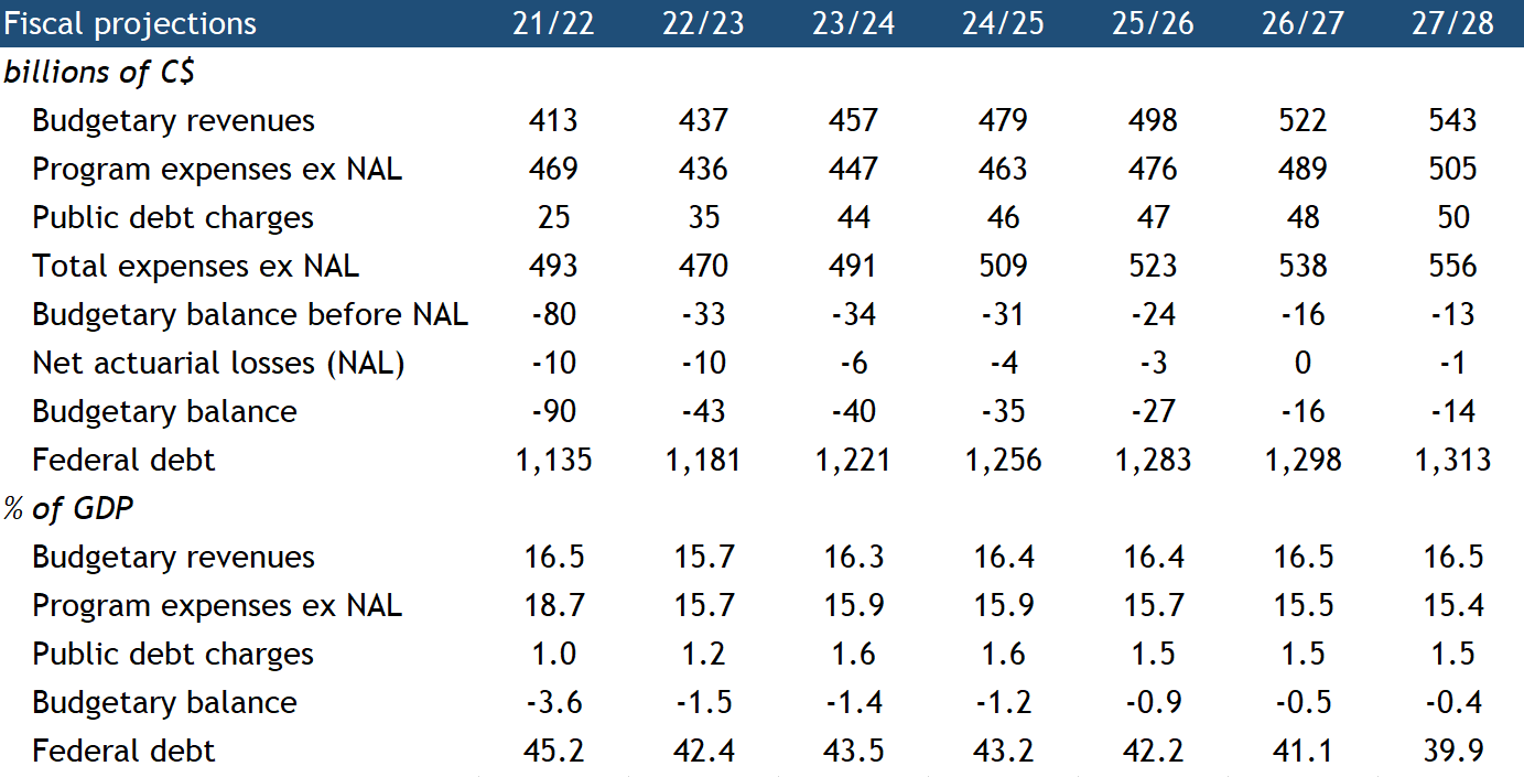 - Debt-to-GDP falls to 40% at the end of the government’s projection, retracing less than half of the nearly 17 ppt increase seen during the pandemic.