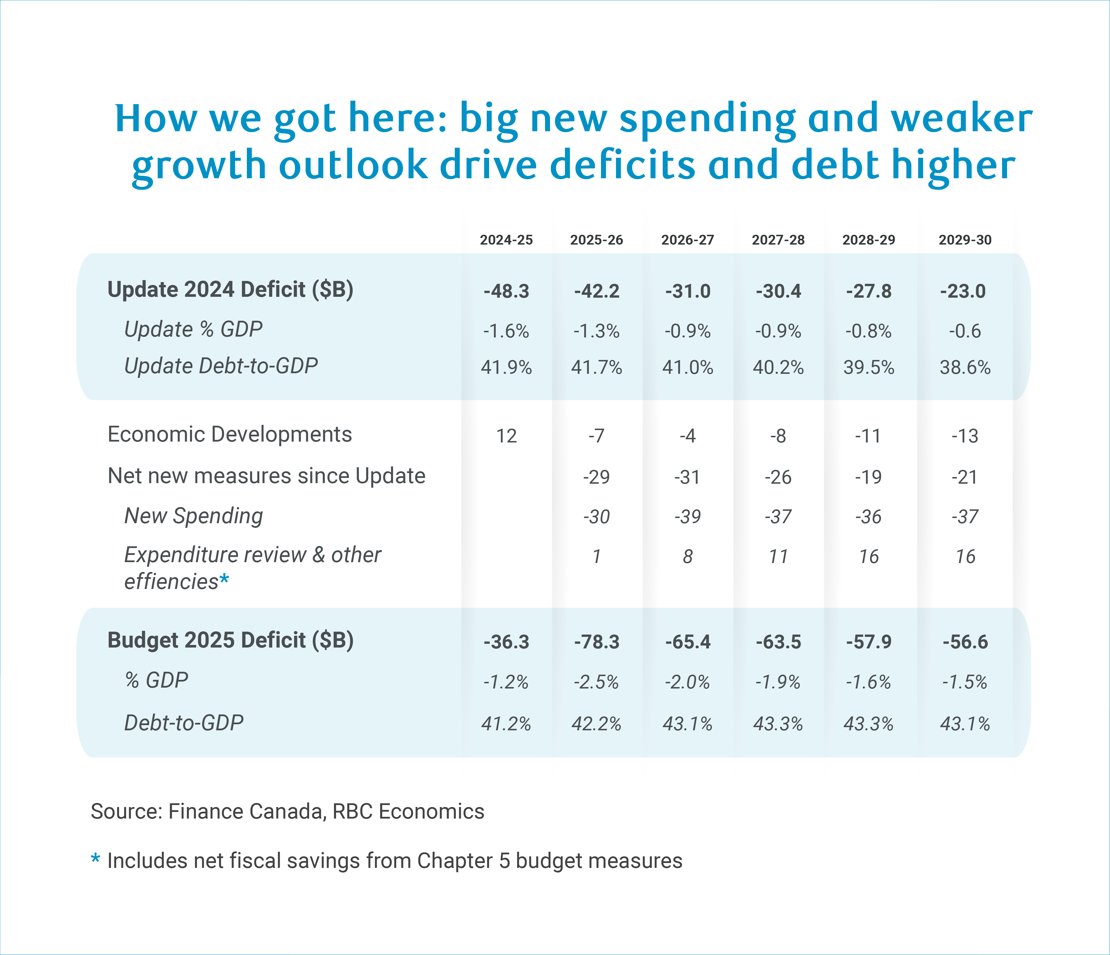 Comprehensive Expenditure Review savings are set to deliver $44 billion over five years, versus the $68 billion we penciled into our baseline, already lower than some other forecasters. With more detailed information provided for each federal department, it will take time to determine how tangible some of these savings are.