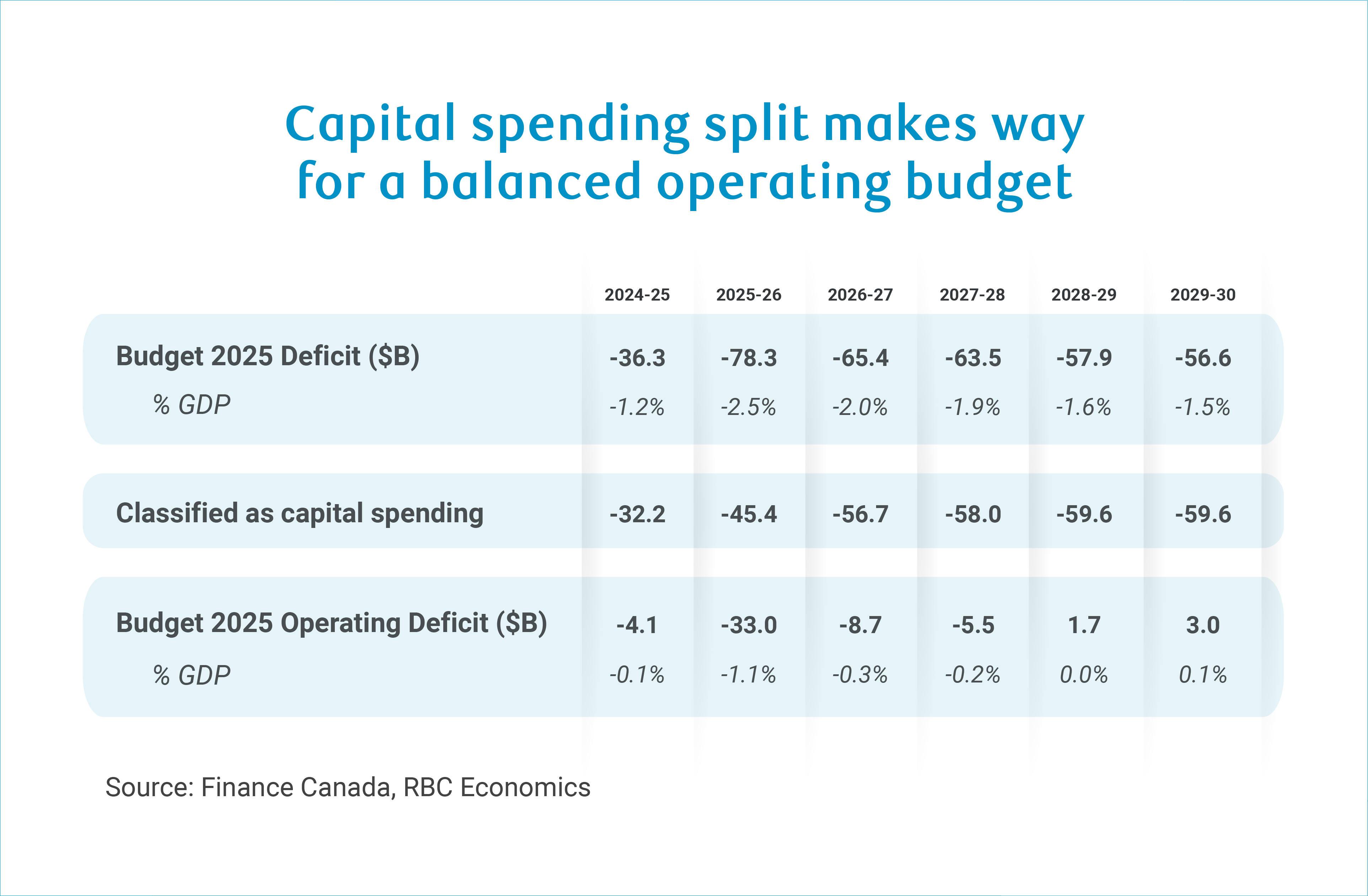 Spending reclassified as capital ranges from 1.4% to 1.7% of GDP from 2025-26 on. This leads to the operating budget balance improving to -0.3% of GDP next year and becoming positive from 2028-29, meeting the other stated fiscal anchor of balancing the operating balance within three years.